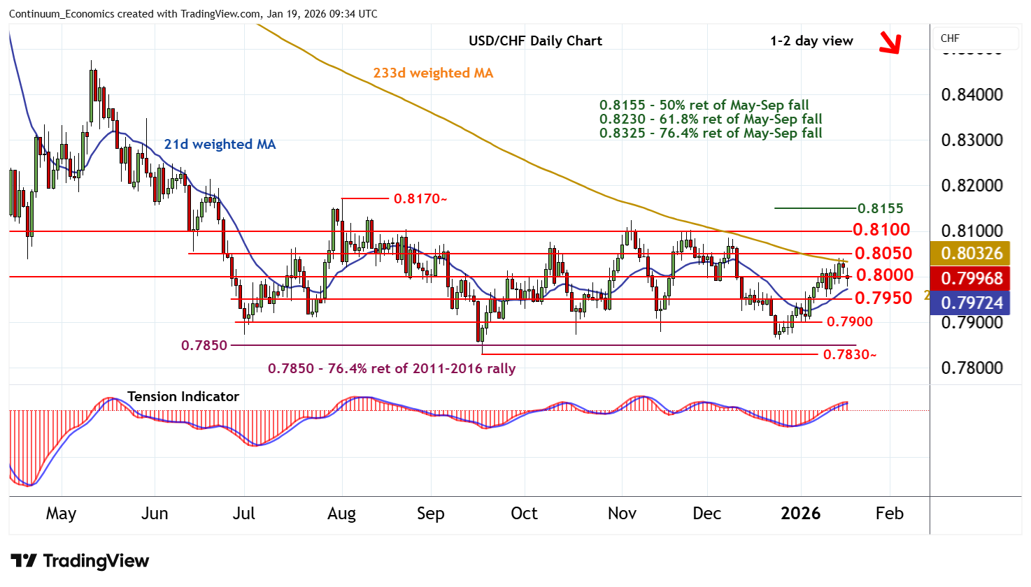 09:20 GMT - Choppy trade beneath resistance at 0.8050 has given way to a sharp pullback, as intraday studies turn down, with the break below 0.8000 bouncing from 0.7980~ to currently trade around 0.8000. Overbought daily stochastics are turning down, unwinding negative divergence, and the positive daily Tension Indicator is flattening, suggesting room for fresh losses in the coming sessions. A close below congestion support at 0.8000 will add weight to sentiment and open up further congestion around 0.7950. However, rising weekly charts could limit any initial tests in consolidation. Meanwhile, resistance remains at 0.8050 and should cap any immediate tests higher.