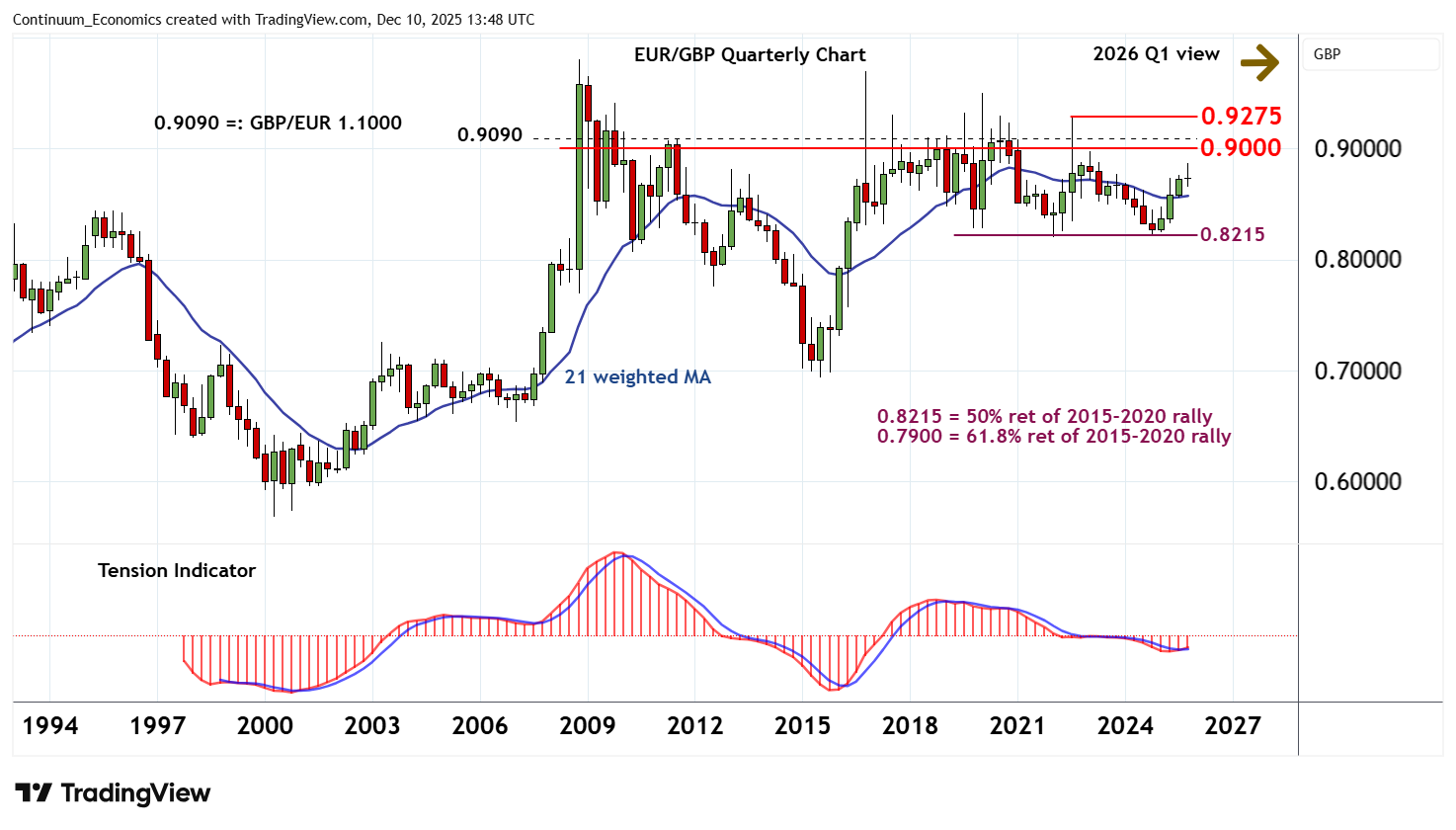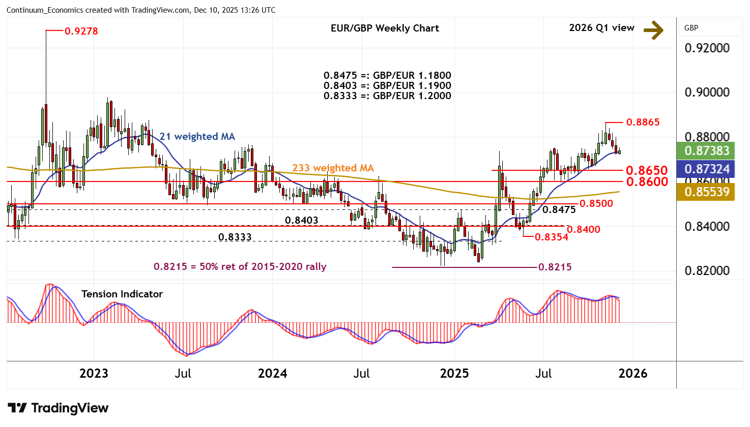 Weekly stochastics and the weekly Tension Indicator are under pressure, highlighting room for deeper losses into early 2026 Q1, with focus to turn to congestion around 0.8650.