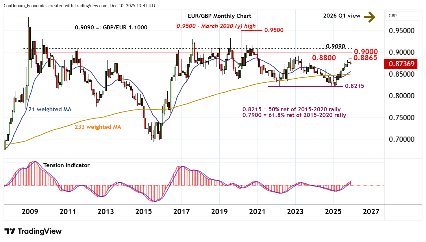 Just lower is 0.8600, but mixed/positive monthly charts and bullish longer-term readings are expected to limit any tests in renewed buying interest/consolidation.