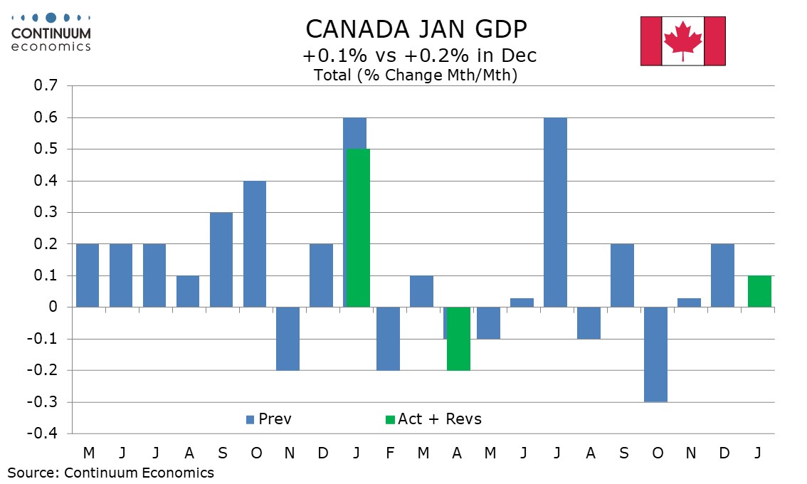 January Canadian GDP with a 0.1% increase is stronger than the unchanged preliminary estimate made with December’s data. The preliminary estimate for February is for a stronger increase of 0.2%.
