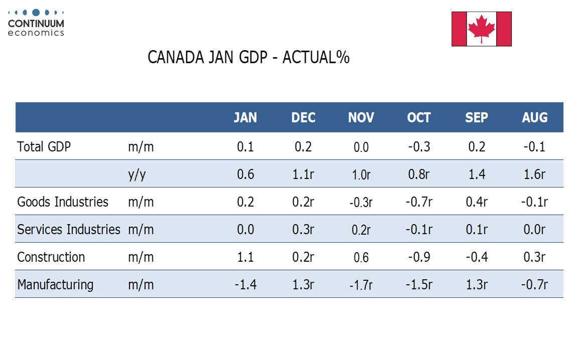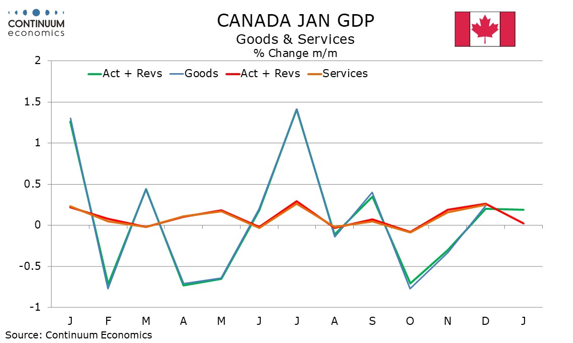 January’s gain came largely in goods, which incased by 0.2%, with services output unchanged. The goods gain came despite a 1.4% fall in manufacturing, with gains seen in construction, mining and utilities. Services were restrained by slippage in wholesale and transportation/warehousing.