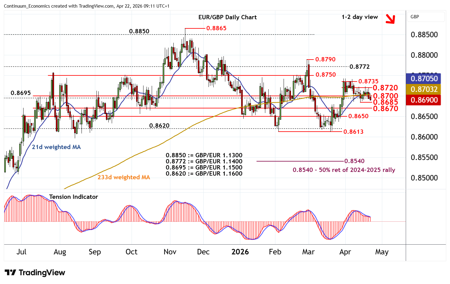 09:00 BST - Consolidation above 0.8695/00 is giving way to a break lower, with focus turning to the 0.8685 weekly low of 14 April. Daily readings have ticked down and weekly stochastics are also coming under pressure, highlighting a deterioration in sentiment and room for a later break. April losses will then target congestion around 0.8670. However, the rising weekly Tension Indicator should limit any deeper losses in fresh consolidation above further congestion around 0.8650. Meanwhile, a close back above 0.8695/00 would help to stabilise sentiment and prompt consolidation beneath 0.8720.