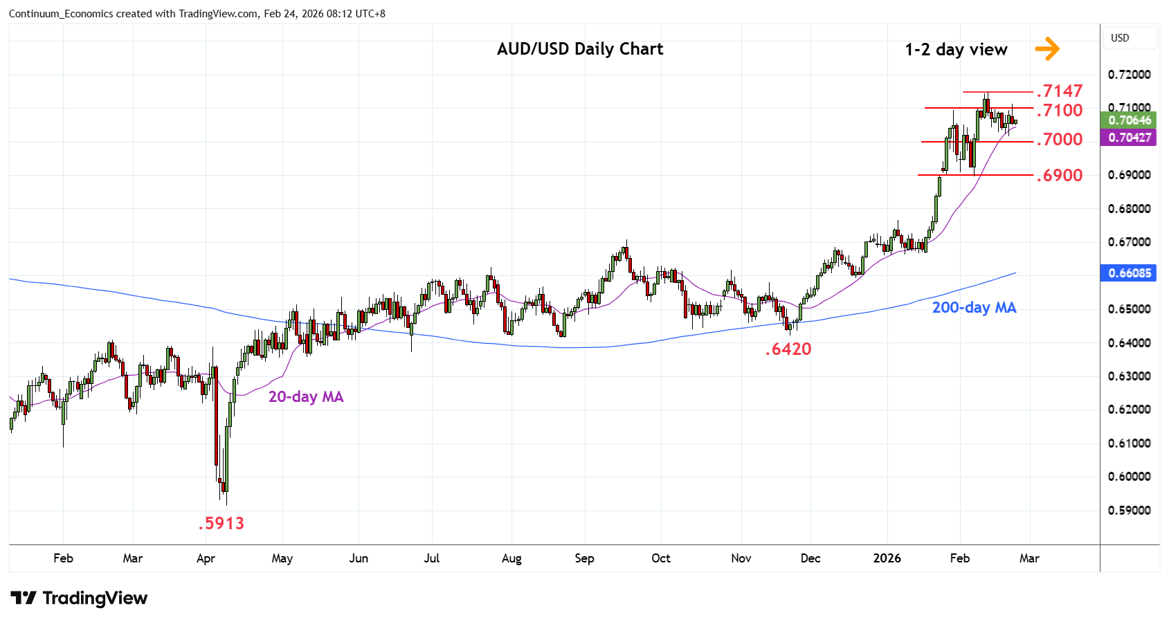 00:15 GMT - Little change, as prices settled back in consolidation following failure to sustain break above resistance at .7100. Would need to regain this to expose the .7147 high to retest and see scope to further retrace the 2021/2025 losses to .7205, 61.8% Fibonacci level. Meanwhile, support at the .7015 low should underpin. Would take break here to open up room for deeper pullback to retrace the November/February rally. Lower will see room for deeper pullback to strong support at the .6900 level and .6870, 38.2% Fibonacci level.