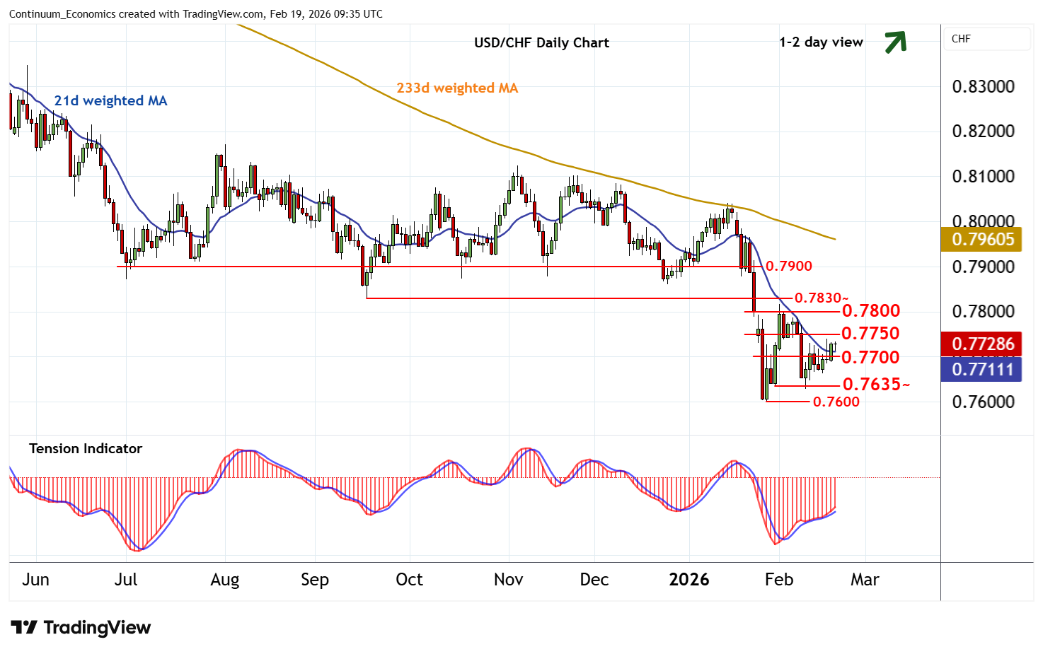 09:30 GMT - Little change, as prices extend cautious around 0.7725. Daily stochastics and the daily Tension Indicator are rising, suggesting room for a move towards congestion resistance at 0.7750. But already overbought daily stochastics and mixed weekly charts should limit initial tests in consolidation. A break, if seen, is expected to meet fresh selling interest beneath 0.7800. Following cautious/corrective trade, lower levels are looked for. A break below support at 0.7700 will add weight to sentiment and put focus on the 0.7635~/50 range. But a later close below the 0.7600 current year low of 28 January will turn sentiment negative and confirm continuation of long-term bear trends.