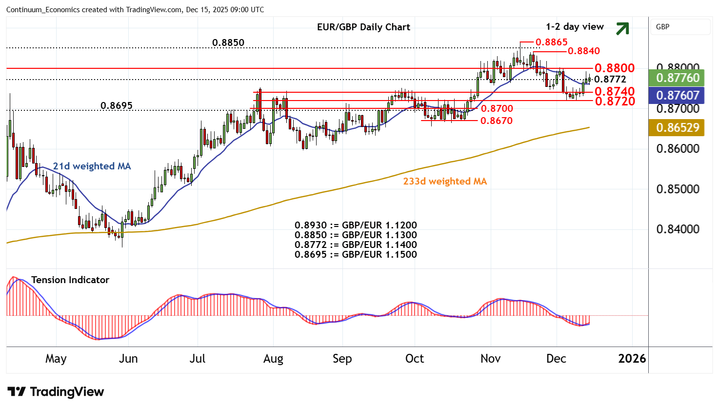 Little change, as prices extend choppy trade around resistance at 0.8772, (GBP/EUR 1.1400)