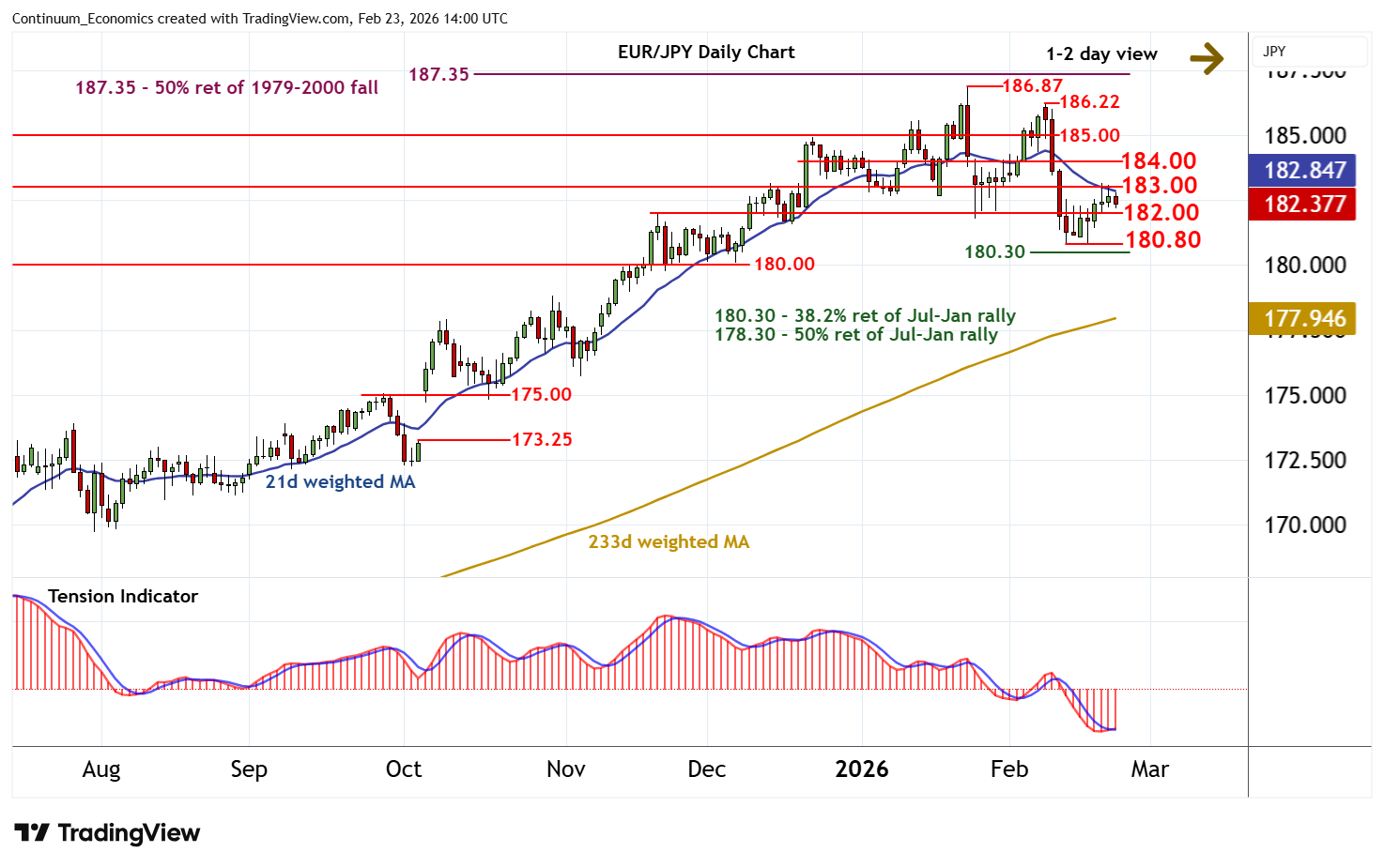14:00 GMT - Little change, as prices extend cautious trade within the 182.00 - 183.00 range. Positive daily readings have flattened, highlighting a cautious tone and room for further consolidation into the coming sessions, before bearish weekly charts prompt renewed losses. A later close below congestion support at 182.00 will add weight to sentiment and open up critical support at the 180.80 current year low of 12 February and congestion around 181.00. Continuation beneath here will extend January losses beneath the 180.30 Fibonacci retracement. Meanwhile, a close above 183.00, if seen, will open up congestion around 184.00, where fresh selling interest is expected to appear.