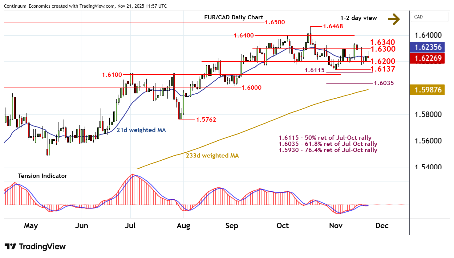 11:40 GMT - Consolidation around congestion support at 1.6200 has given way to a sharp bounce towards congestion resistance at 1.6300, before falling back as overbought intraday studies unwind, to currently trade around 1.6225. Both daily stochastics and the daily Tension Indicator are falling, highlighting room for fresh losses in the coming sessions. A break back below 1.6200 will open up critical support within the 1.6135~ weekly low of 3 November and the 1.6115 Fibonacci retracement. Mixed/negative weekly charts could limit any initial tests in consolidation, before fresh losses are seen. Meanwhile, resistance remains at 1.6300 and extends to the 1.6340 weekly high of 13 November. An unexpected close above here would improve sentiment and extend November gains towards 1.6400, where fresh selling interest is expected to appear.