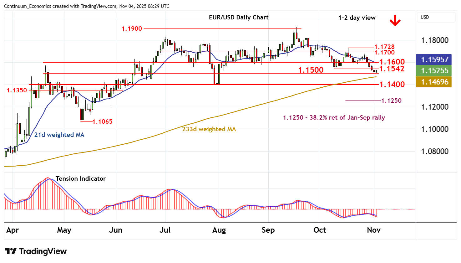 08:25 GMT - Little change, as mixed intraday studies keep near-term sentiment cautious and extend consolidation above congestion support at 1.1500. Daily readings are under pressure and broader weekly charts are negative, highlighting a bearish tone and room for still deeper losses in the coming sessions. A close below 1.1500 will add weight to sentiment and extend September losses towards stronger support at 1.1400. A further close beneath here would complete a multi-month distribution top beneath 1.1900 and put focus on the 1.1250 Fibonacci retracement. Meanwhile, resistance remains at the 1.1542 weekly low of 9 October. A close back above here would help to stabilise price action and prompt consolidation beneath congestion resistance at 1.1600.