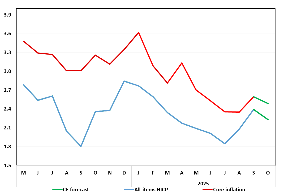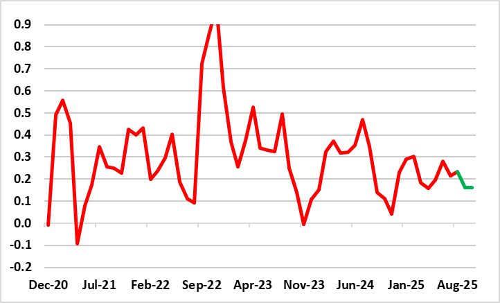 Germany’s disinflation process hit a further and more-than-expected hurdle in September, as the HICP measure rose 0.3 ppt for a second successive month, thereby even more clearly up from July’s 1.8% y/y, that having been a 10-mth low. But we see most, if not all, of this rise being reversed in the October numbers to 2.2% (Figure 1) and with more falls in the headline and core to come into 2026. This (again) may come in spite of energy base effects but with service prices this time contributing slightly to the downside – refreshing a softening trend for the latter. If so, the result would see the CPI core back down a notch to 2.5%). Regardless, as we have suggested before, core adjusted data are telling a more reassuring tale (Figure 2).