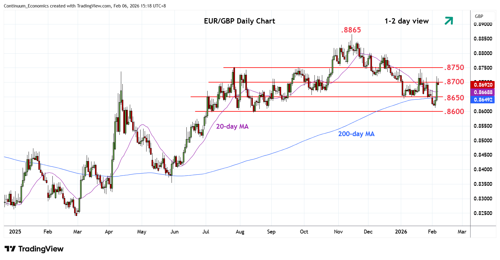 07:25 GMT - No follow-through on break of resistance at the .8700 level as prices settled back from the .8720 high to consolidation gains from the .8610 low. Positive daily studies suggest room for further gains later. Above the .8700 level and .8720 high will see stronger gains to retrace losses from the January high to strong resistance at the .8750, July and September highs. Corrective gains are expected to give way to renewed selling pressure later. Meanwhile, support is raised to the .8650 congestion. Would take break to open the .8610/00 to retest and see room to extend losses from the .8865, November 2025 year high.