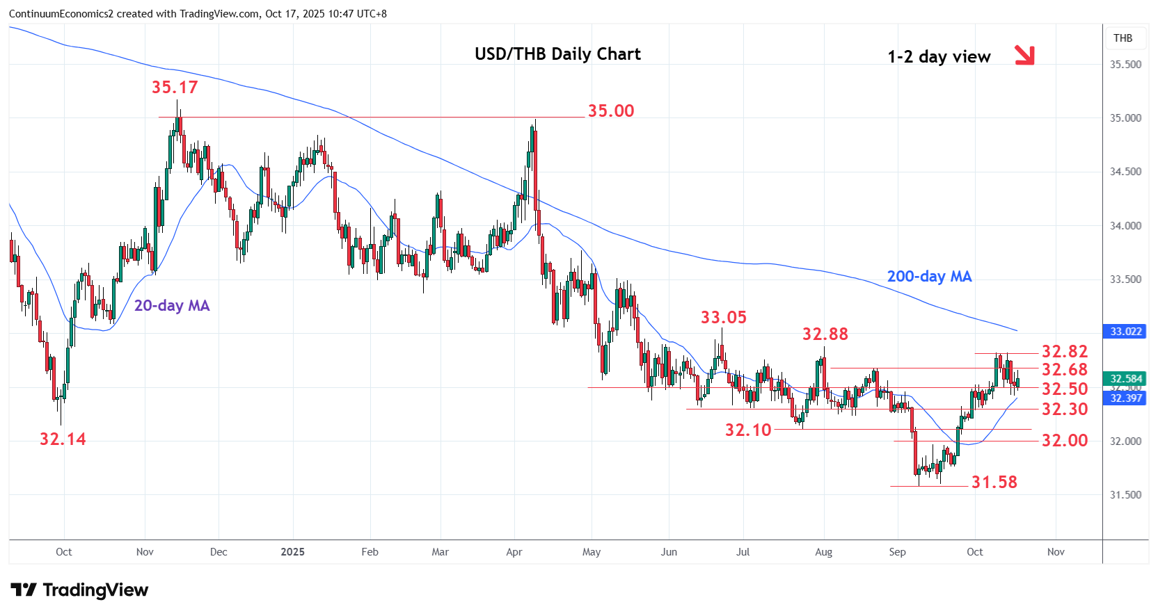02:50 GMT - No follow-through on break of the 32.50 support as prices consolidate pullback from the 32.82 high. However, pressure remains on the downside and break here will open up room for deeper pullback to retrace the September/October gains. Daily studies are unwinding overbought reading and lower will see room to strong support at the 32.30 congestion. Below this will turn focus to the 32.10/32.00 area. Meanwhile, resistance at 32.68 is expected to cap and sustain losses from the 32.82 high.