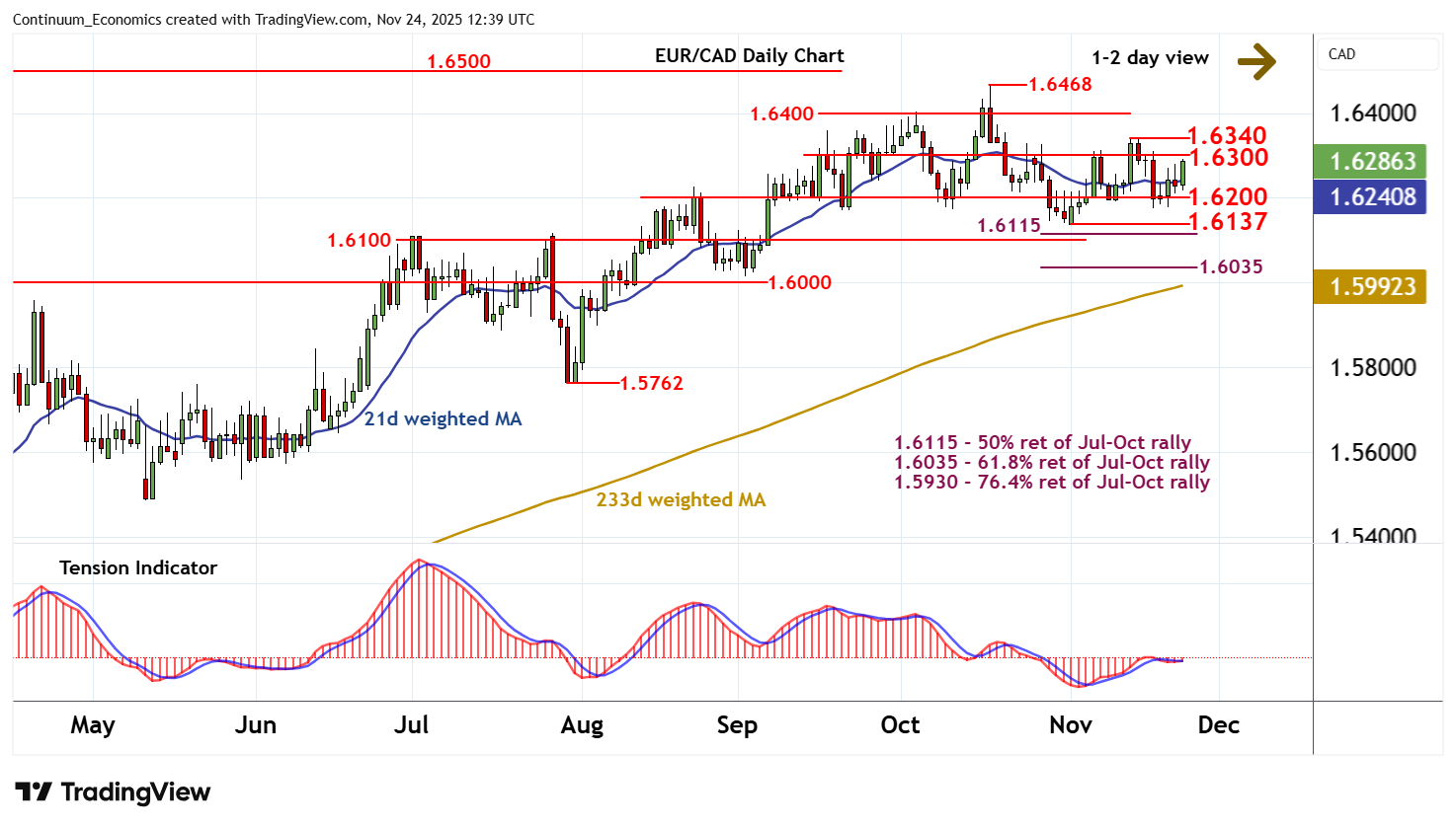 12:25 GMT - Choppy trade above congestion support at 1.6200 has given way to a fresh bounce, as intraday studies turn higher once again, with focus congestion resistance at 1.6300. Daily readings are also improving, suggesting room for a test above here. But mixed/negative weekly charts are expected to limit scope in renewed selling interest/consolidation beneath strong resistance at the 1.6340 weekly high of 13 November. A close above here, if seen, would improve sentiment and extend November gains towards 1.6400, where fresh selling interest is expected to appear. Meanwhile, any initial tests below 1.6200 should give way to consolidation above stronger support at the 1.6135~ weekly low of 3 November and the 1.6115 Fibonacci retracement.