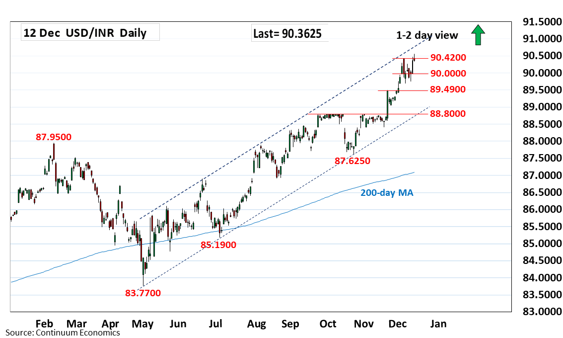 05:30 GMT - Consolidation has given way to renewed buying pressure to reach fresh record high above 90.5000. Bullish structure keeps focus on the upside to extend the underlying bull trend and higher will see room to 90.7500 Fibonacci extension then the 91.0000 figure. Meanwhile, support is raised to the 90.0000 figure and extending to the 89.6950 higher low. This area now expected to underpin and limit corrective pullback. Break here will ease the upside pressure and open up room for deeper pullback to strong support at 89.4900, November high.