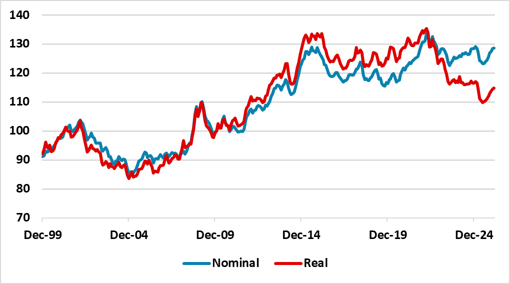 The MXN has not been impacted by President Donald Trump desire to renegotiate USMCA in 2026, as desires have not yet been followed by threats. However, USTR Greer is clear that Trump wants separate addendums for Mexico and Canada for the USMCA, which suggests that bilateral threats could still increase volatility when negotiations intensify around July 2026. This may mean that MXN recovery is delayed and losses could be seen mid-year. It also worth noting that the MXN has now become overvalued versus 10 and 25yr average on an REER basis (Figure 4). This could bring USDMXN back to 18.00-18.25. Even so, with the Fed and Banxico likely to both cut by 50bps this year, interest rate differentials will still encourage carry trade to return and we see USDMXN at 17.50 by end 2026. MXN will also be supported by the view that U.S./Mexico will agree a renegotiated USMCA successfully by early 2027, which is rightly regarded as a long-term positive – the alternative risk of no renewal and USMCA ending in 2036 is low risk, as Trump eventually wants a deal after his likely theatrics.