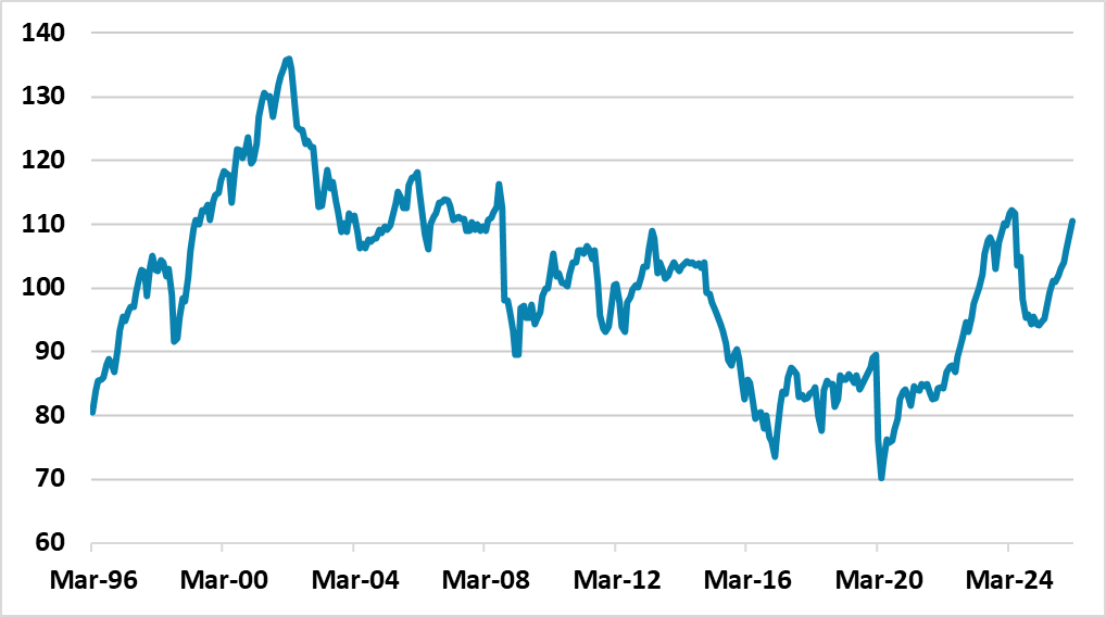 How much China is willing to allow the Yuan to appreciate against the USD is not currently clear, as the Yuan real depreciation (Figure 2) could allow lots of room. Previously Yuan appreciation has occurred in a stepwise fashion. A 2.5-5% appreciation followed by smoothing FX intervention to allow the Yuan to consolidate followed by further appreciation. Some have also focused on the extra line recently added to President Xi Jinping's 2024 speech that the yuan should be widely used in global trade, investment, FX markets, and more importantly, have the status of a global reserve currency. Some argue that this could mean China authorities are happy to allow a larger and more persistent Yuan appreciation. We are less sure, as this is a long-term multi-year goal rather than for 2026, as capital flow restrictions remain. For the Yuan this all likely means that China is happy to allow Yuan appreciation to 6.80 in 2026, but not 6.40-6.50 that would undermine the competitive edge from the decline in the real Yuan over the last few years. Some further appreciation can be seen in 2027, given a multi-year USD decline against low inflation countries and we see USD/CNY at 6.75 by end 2027.