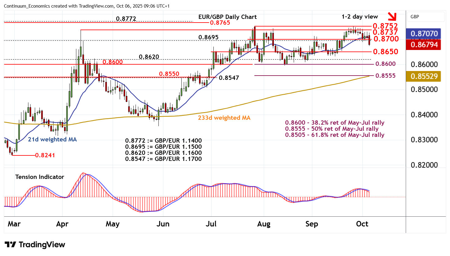 08:55 BST - Cautious trade has given way to a sharp break below 0.8695/00 in EUR-driven trade, with prices currently trading around 0.8680. Intraday studies have turned down and daily readings are under pressure, highlighting room for continuation down to congestion support at 0.8650. Negative weekly charts point to potential for further losses towards 0.8620, (GBP/EUR 1.1600). Meanwhile, a close back above 0.8695/00, if seen, would help to stabilise price action and prompt consolidation beneath critical resistance within 0.8737/52.