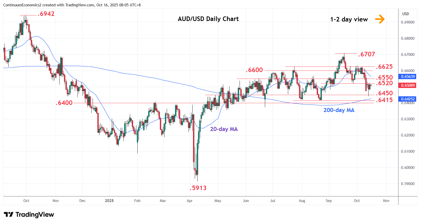 00:15 GMT - Turned up from the .6440 low to reach resistance at .6520 as prices consolidate losses from the .6600/25 area. Prices are unwinding oversold intraday and daily studies but this is expected to give way to fresh selling pressure later. Below support at .6470 and the .6440 low will see room for deeper pullback to retrace the April/September rally. Lower will see extension to strong support at the .6415/00, August low and 38.2% Fibonacci level. Meanwhile, resistance is at .6520 and this extend to the .6550 congestion which is expected to cap and sustain losses from the .6600/25 resistance.