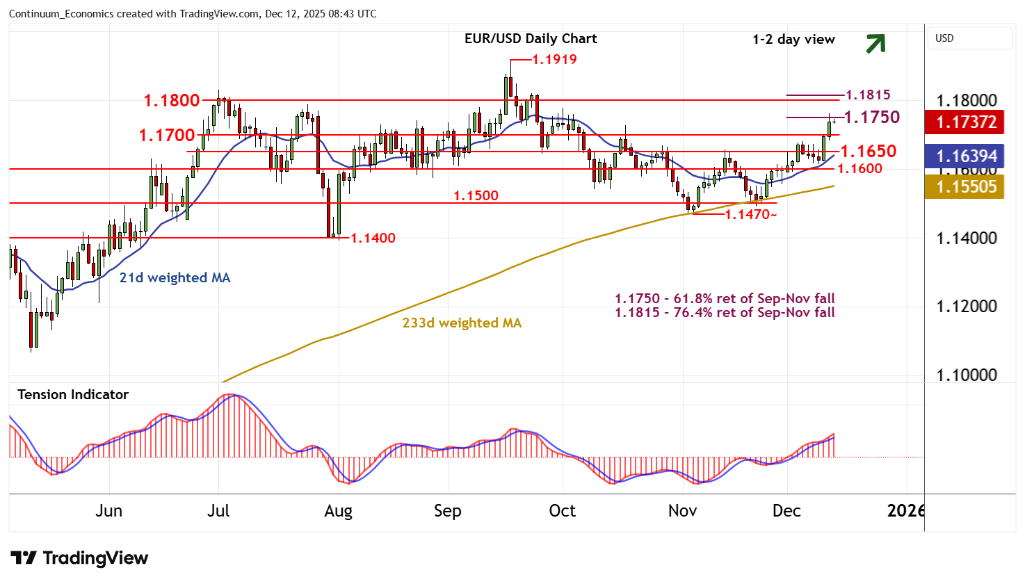 08:30 GMT - Anticipated gains have reached resistance at the 1.1750 Fibonacci retracement, with prices extending to 1.1763 before settling into consolidation beneath 1.1750. Overbought intraday studies are unwinding, suggesting room for a minor pullback. But rising daily readings and positive weekly charts should limit scope in renewed buying interest towards congestion support at 1.1700. Following cautious/corrective trade, fresh gains are looked for. A close above 1.1750 would improve sentiment and extend November gains towards 1.1800/15, where already overbought daily stochastics could prompt profit-taking/consolidation. Meanwhile, a close below 1.1700 would turn sentiment neutral and prompt further consolidation above 1.1650.