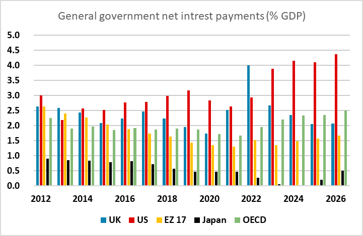 From a fundamental perspective, the case for a weaker JPY due to Takaichi becoming PM looks pretty flimsy. She is an adherent of Abenomics, which has led some to expect she will try for both easier fiscal and monetary policy. But whatever some believe, the BoJ is independent and an expansionary fiscal policy will likely lead to higher rather than lower Japanese yields. The other argument put forward for a weaker JPY is that the Japanese fiscal position will become unsustainable if fiscal policy is eased further. But while the level of government debt is very high, interest payments on the debt are very low, and are dwarfed by US and UK levels, so it will take a long time before these will become a problem, especially since Japan runs a big current account surplus and the debt is 88% domestically funded, with almost half owned by the BoJ.