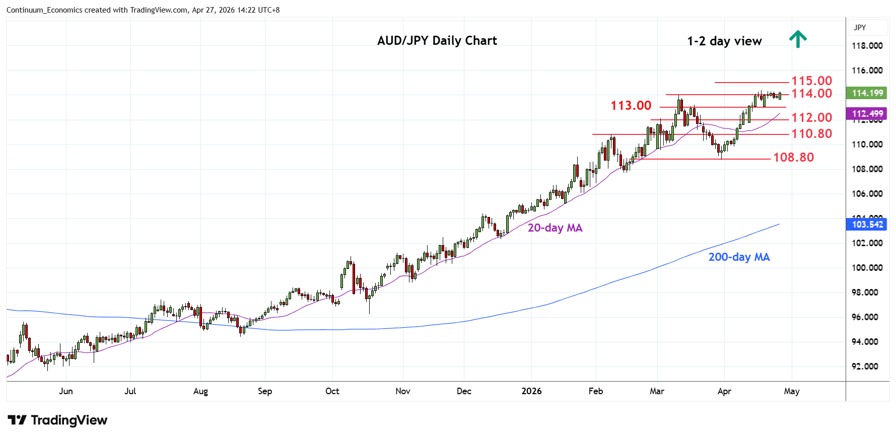 06:30 GMT - Little change, as prices extend consolidation within a narrow range below the 114.35 high. Pressure remains on the upside and break here will further extend strong gains from the April 2025 year low and see room for extension to the 115.00/116.00 congestion area. However, overbought daily studies caution corrective pullback with support raised to the 113.00/112.00 congestion area. Would take break here to open up room for deeper pullback to support at the 110.80/110.00 area and the 108.80, March swing low.