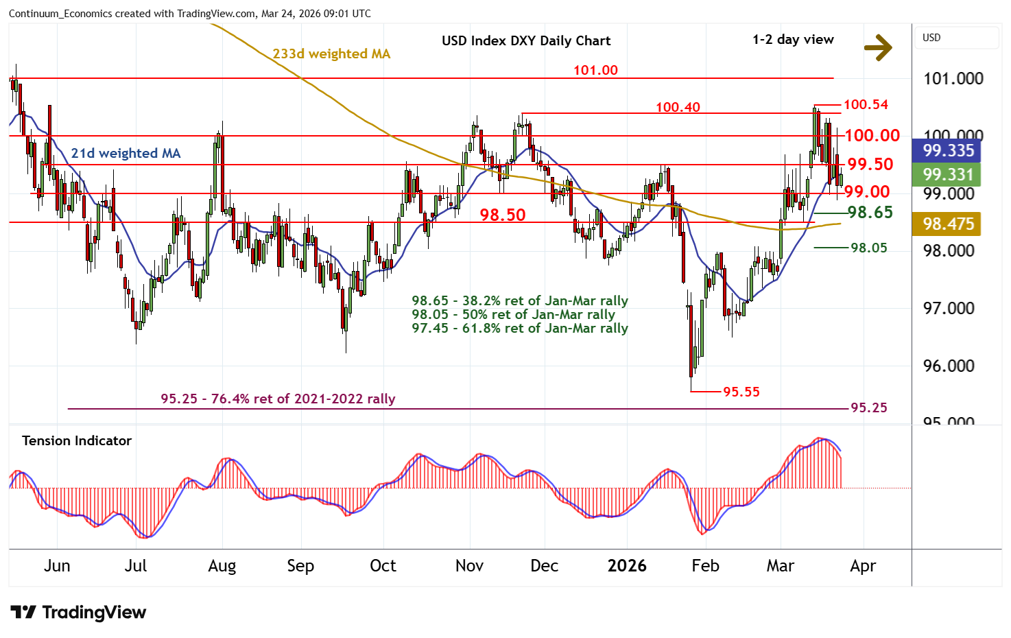 | R3 | 100.40/54 | ** | 21 Nov (m); 13 Mar YTD highs | S2 | 98.65 | * | 38.2% ret of Jan-Mar rally | |