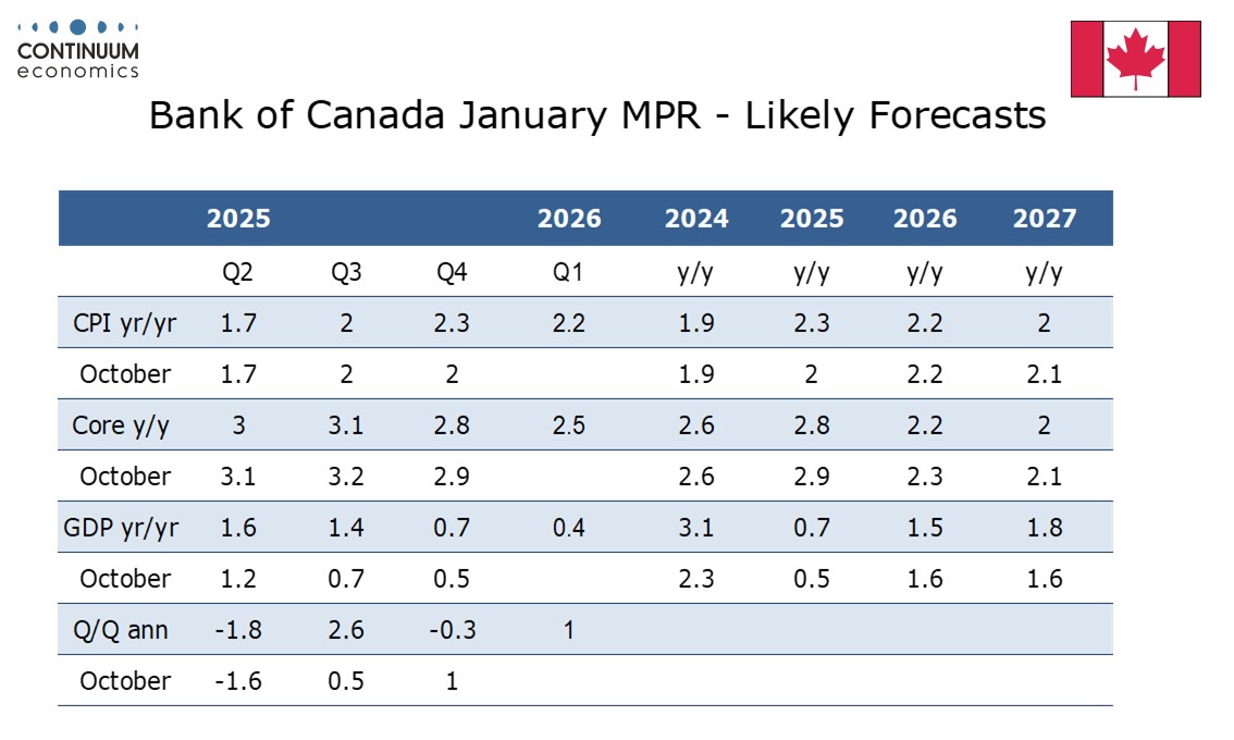 A slightly stronger growth view than in October but a slightly softer inflation view suggests that despite the surprises seen in data since October, the BoC will not need to change its view that rates are at about the right level. High uncertainty given the geopolitical environment, with Greenland and the upcoming USMCA negotiations both carrying significant risks for Canada, will mean that the BoC will reiterate that if the outlook changes it is prepared to respond. Our central view has the economy in late 2026 seeing growth back in line with potential and inflation getting close to target, with a 25bps tightening in October and another in 2027 to put rates in the middle of the neutral range. However, a shock that damages the outlook sufficiently to see the BoC resuming easing is a significant risk.