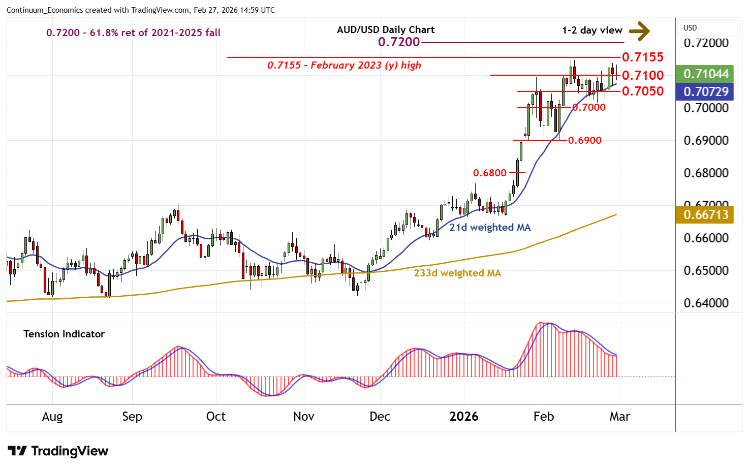 14:55 GMT - Little change, as prices extend cautious trade above support at 0.7100. Negative intraday studies highlight room for a break. But rising daily readings should limit scope in renewed buying interest/consolidation above congestion around 0.7050. Meanwhile, resistance remains at 0.7145/55~. A close above here is needed, not yet seen, to turn sentiment positive and extend April 2025 gains towards the 0.7200 Fibonacci retracement.