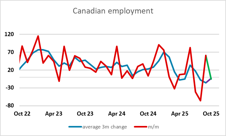 While the government shutdown still means there is no US employment report on Friday, there is a Canadian employment report. The market consensus is for a 5k decline in October following a 60k rise in September, which would imply a marginal improvement in the trend. The CAD will clearly be focused on this data, as USD/CAD has moved up substantially over the last week, largely because of reduced expectations of Fed easing and higher US yields. The USD/CAD rise is broadly consistent with the rise in the yield spread that we have seen, but there is scope for some increase in expectations of BoC easing if we see weakness in the Canadian numbers which could increase the pressure on the CAD. Strength in the Canadian numbers could help trigger a CAD recovery, but there is little chance of the market pricing in much less easing given there are no more cuts fully priced