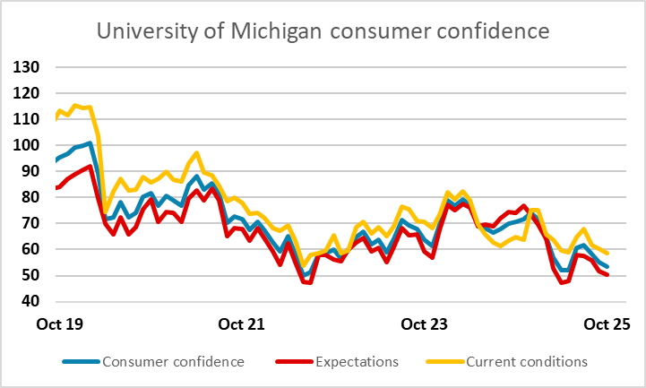 If the US job market really did deteriorate significantly in October we may see it reflected in weakening consumer confidence in the University of Michigan survey. The picture was already quite weak in recent months, but further evidence of weakness, taking confidence levels below the 2022 lows cold be expected to further undermine risk sentiment and trigger more JPY strength.