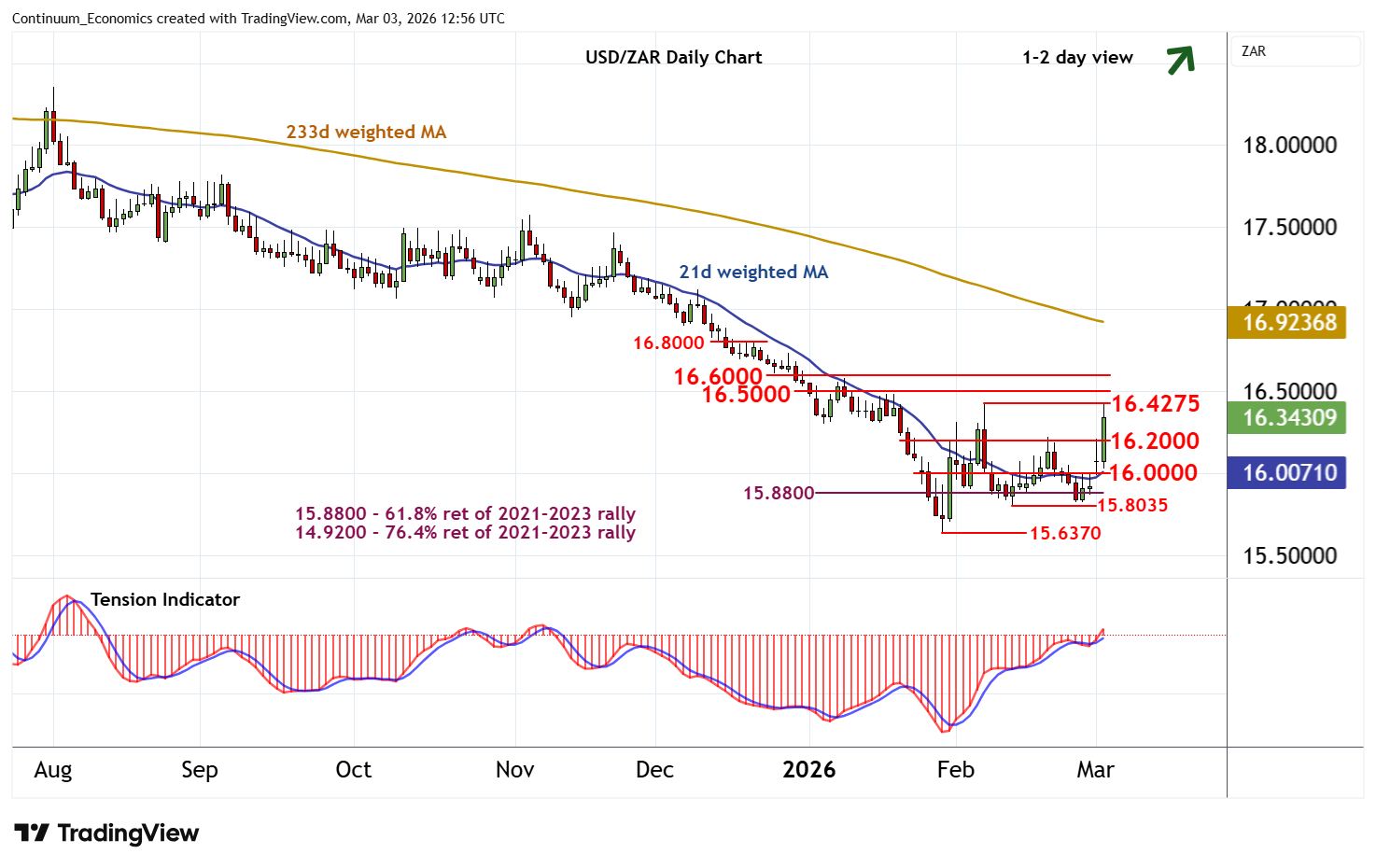 12:30 GMT - Anticipated gains have reached resistance at the 16.4275 monthly high of 6 February, where short-term reactions are prompting a pullback to 16.3500. Daily studies are rising and broader weekly charts are improving, highlighting room for further strength in the coming sessions. A close above here will improve sentiment and extend late-January gains, initially into the 16.5000 - 16.6000 range. Beyond here is 16.8000. Meanwhile, support is raised to congestion around 16.2000. A close back beneath here, if seen, will turn sentiment neutral and prompt consolidation above congestion around 16.0000.