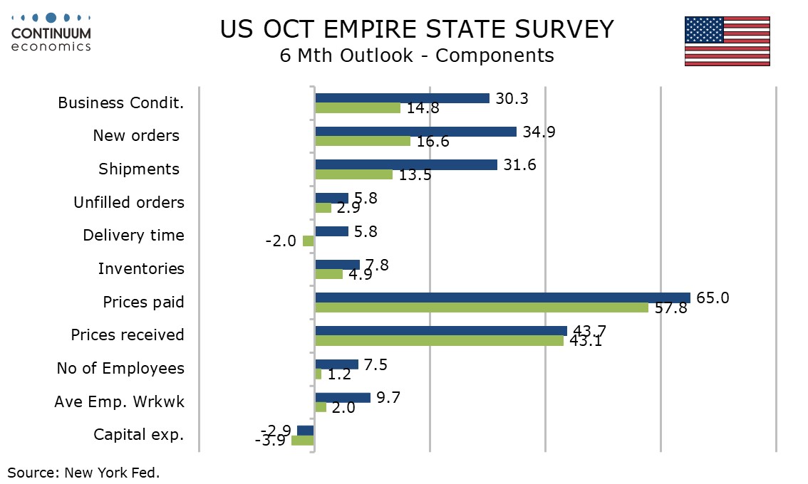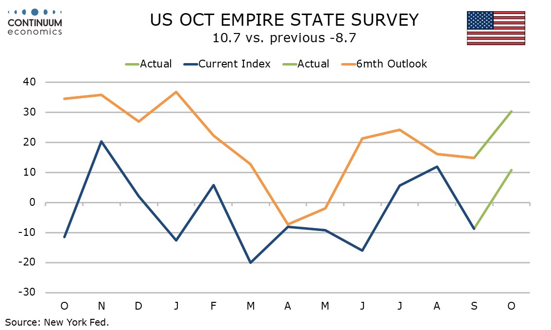 October’s Empire State manufacturing index at a positive 10.7 has rebounded from a weak -8.7 in September though remains below August’s level of 11.7. The series is volatile and may not be a useful signal for other surveys. In September, when the Empire State index was weak, the Philly Fed manufacturing survey as surprisingly strong at 23.2. The underlying manufacturing picture is probably still fairly neutral.