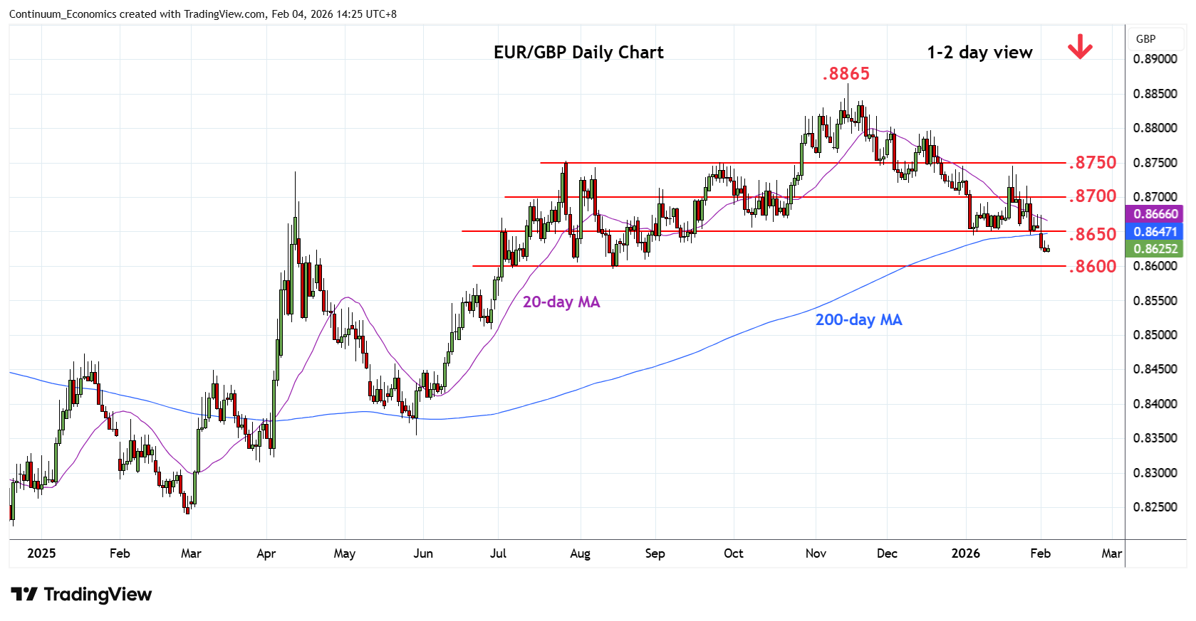 06:30 GMT - Consolidating test of support at the .8620/00, 38.2% Fibonacci level and congestion area. Below this will extend the broader losses from the .8865 November 2025 year high and trigger a 7-month top pattern at the November high and open up room for deeper retracement of the 2024/2025 rally. Lower will see extension to the .8550/45, congestion and 50% Fibonacci level. Meanwhile, .8650 January low and congestion area reverts to resistance and is expected to cap and sustain losses from the .8865 high.
