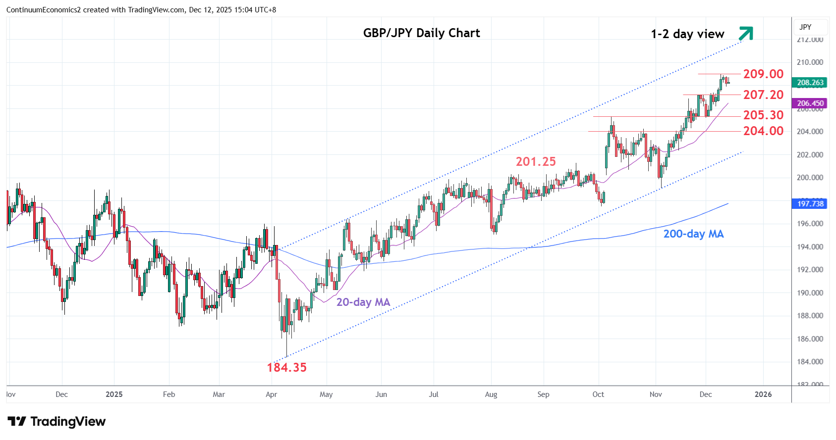 07:25 GMT - Settling back in range beneath the 209.00 level as prices unwind overbought intraday and daily studies. However, bullish momentum suggest corrective pullback likely to remain limited and higher will see room to resistance at the 210.50 and 212.00 congestion from 2008. Meanwhile, support is raised to the 208.00 congestion and this extend to 207.20 November high. Would take break of these to open up room for deeper correction to 206.20/00 congestion and strong support at 205.30/204.00, October highs.