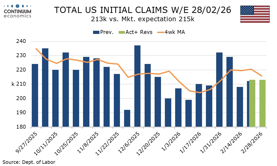 The survey week for February’s non-farm payroll came two weeks ago. The spike in initial claims in late January means that the 4-week average, which fell to 215.75k this week, stood at 219.5k in February’s payroll survey week, up from 204k in January’s but little changed from 217.5k in December’s. January’s payroll was above trend, and unlikely to be matched in February, but a very weak February payroll is not signaled.