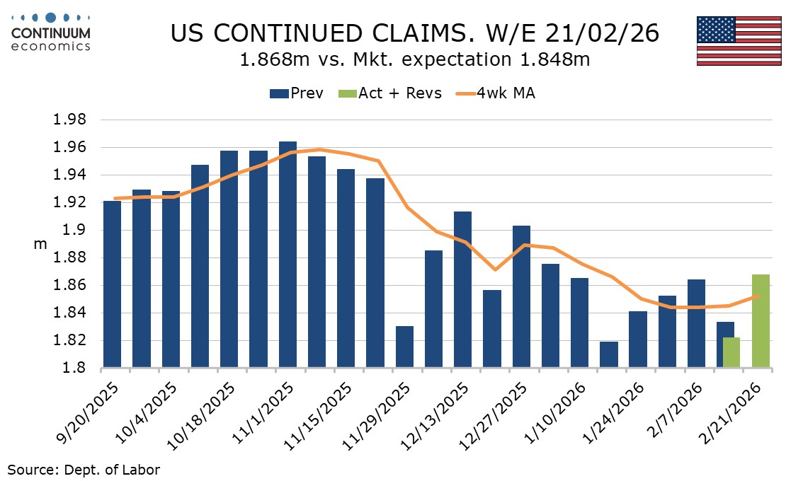 Continued claims cover the week before initial claims, and the week after February’s payroll was surveyed. Here the data was higher than expected, up 46k to 1.868m, but this does little more than erase a 42k decline in the preceding week, which came in the week the payroll was surveyed. A decline in the 4-week average may however be finding a base.