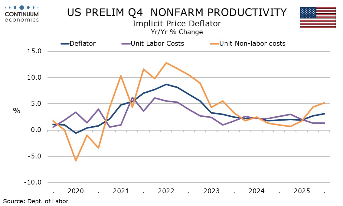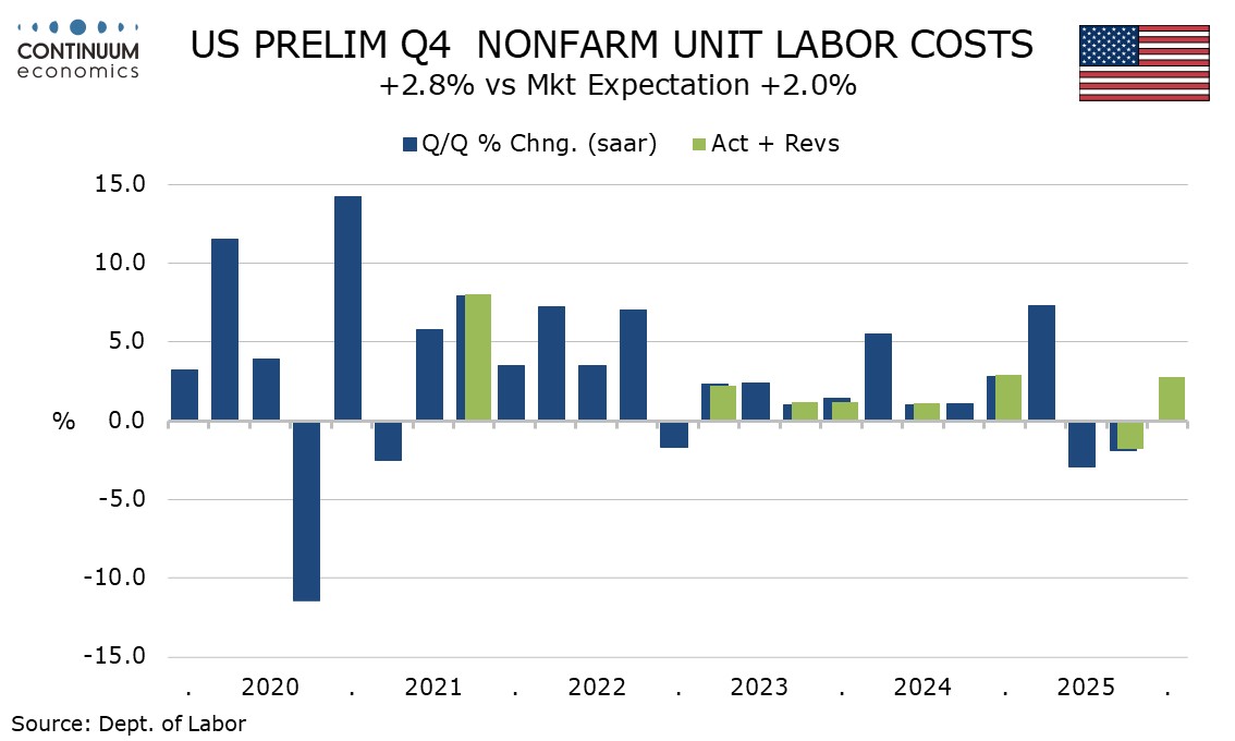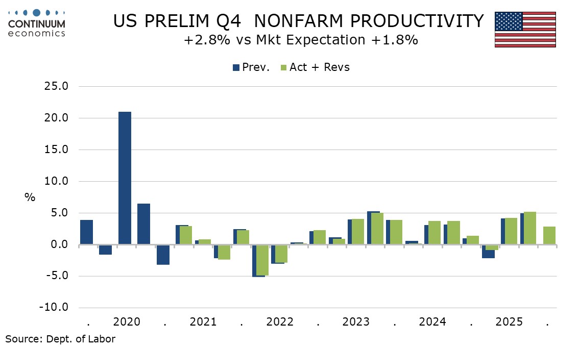 Q4 non-farm productivity at 2.8% was stronger than expected. Non-farm business output rose by 2.6% as signaled by GDP detail, outperforming overall GDP which was depressed by the government shutdown. Aggregate hours worked however fell by 0.2%, weaker than implied by non-farm payroll data, lifting productivity.