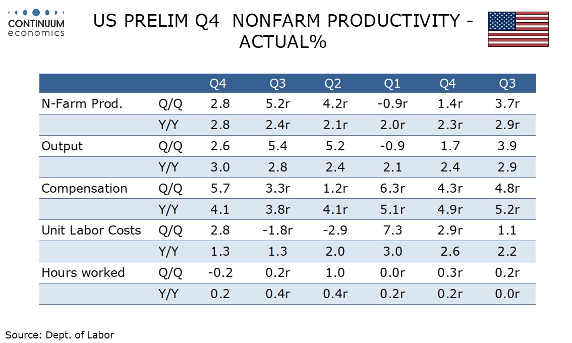 Initial claims are unchanged at 213k, a recent bout of bad weather having no significant impact, contrasting late January when a spell of bad weather did coincide with a rise in initial claims. Q4 productivity data is solid but this is not eliminating inflationary pressures.