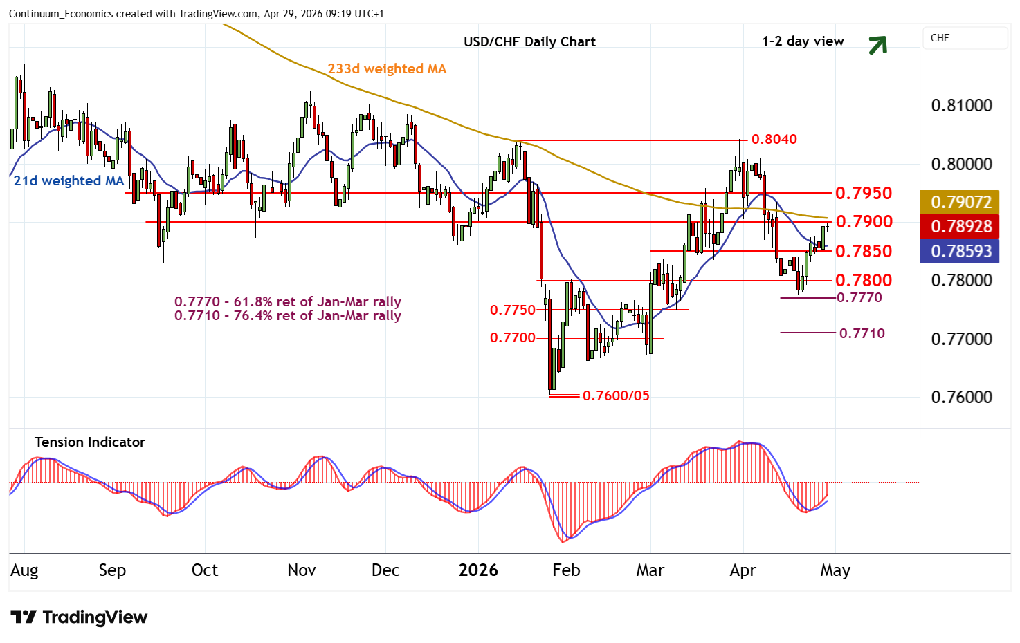09:00 BST - The anticipated test above congestion resistance at 0.7900 has been pushed back from 0.7910~, as intraday studies turn mixed, with prices currently consolidating around 0.7890. Daily readings continue to rise, highlighting room for a retest above here. But mixed/negative weekly charts should limit any immediate break in consolidation beneath further congestion around 0.7950. Meanwhile, support remains at congestion around 0.7850. A test beneath here, if seen, should meet renewed buying interest above further congestion around 0.7800.