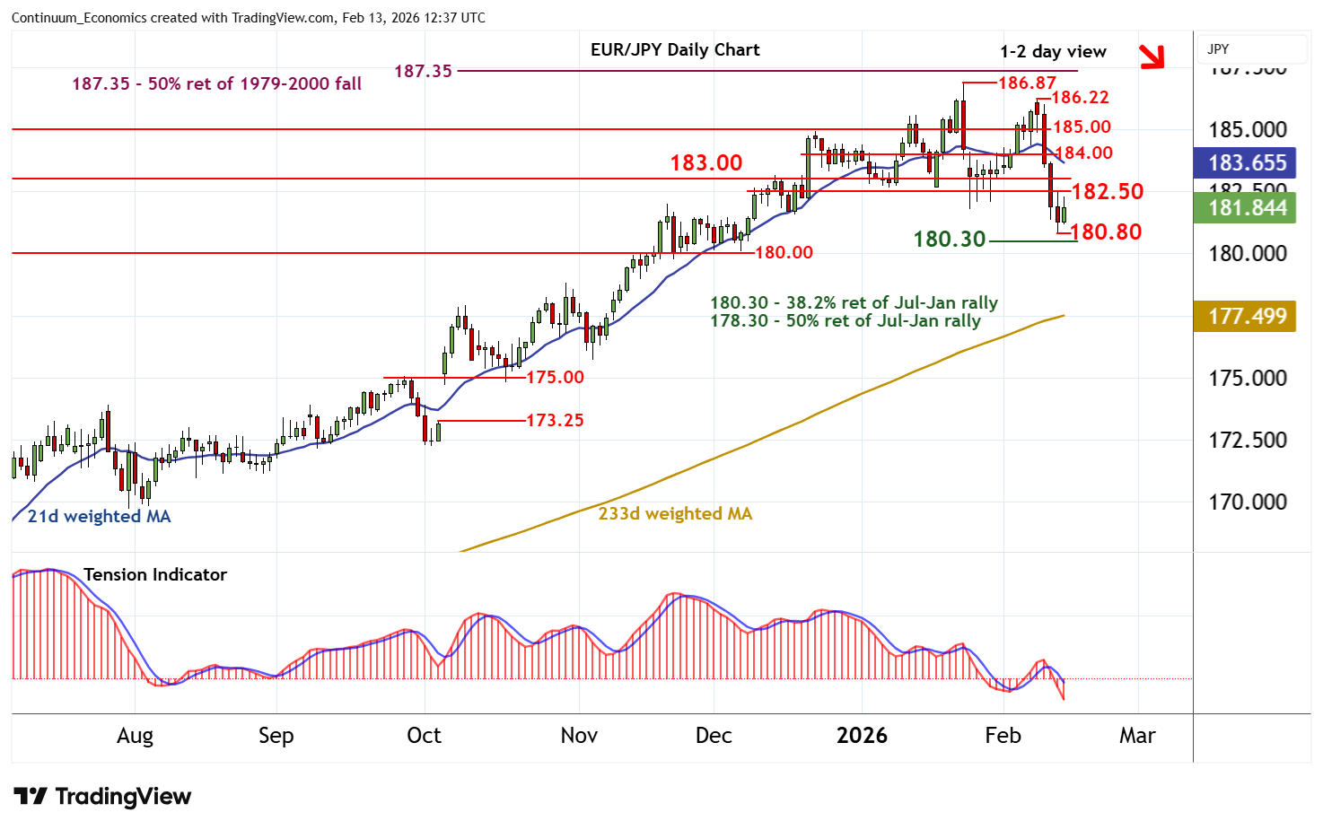 12:15 GMT - Little change, as prices extend consolidation following the bounce from the 180.80 current year low of 12 February. Intraday studies are rising and oversold daily stochastics are flattening, suggesting room for a break above 182.00. But the negative daily Tension Indicator and bearish weekly charts should prompt renewed selling interest towards resistance at 182.50. A close above here, however, would help to stabilise price action and prompt consolidation beneath congestion around 184.00. Following cautious/corrective trade, fresh losses are looked for. A close below 180.80 will add weight to sentiment and extend January losses towards the 180.30 Fibonacci retracement.