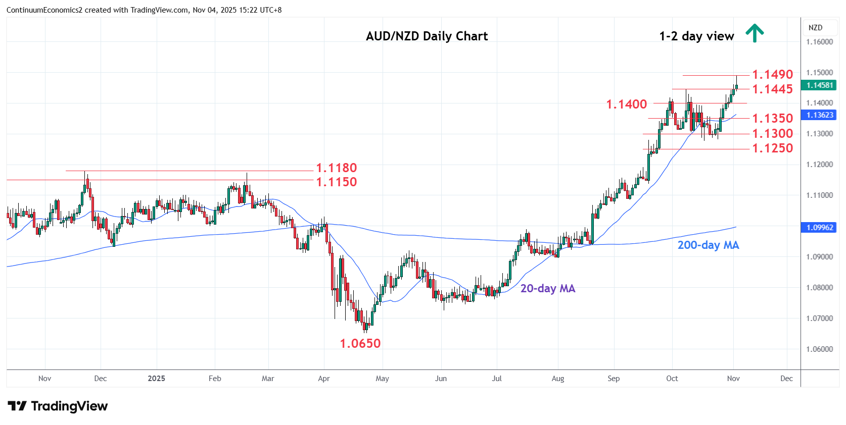 07:40 GMT - Break above the 1.1445 October high has seen extension to tag the September 2022 year high at 1.1490. Reaction here see prices unwinding the overbought intraday and daily studies and settling back in consolidation to the 1.1445/1.1400 support. Weekly chart are stretched as well and caution break here to open up room for deeper pullback to the 1.1350/1.1300 congestion area. Below these will see deeper correction of gains from the April current year low. Above 1.1490 resistance will see room to 1.1580/1.1600 area.