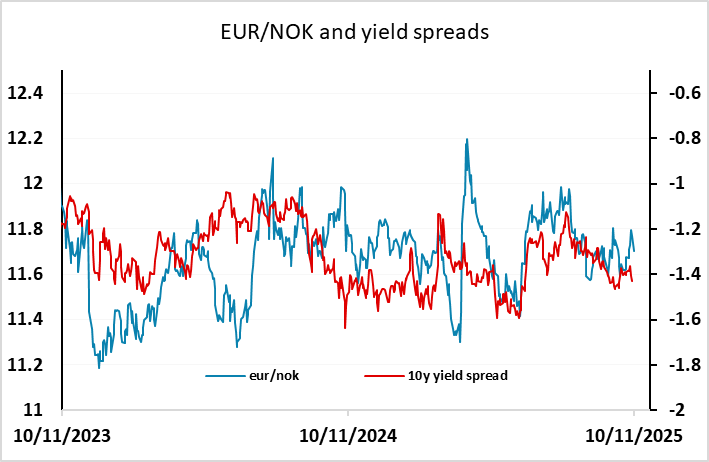 Norway October CPI has come in much stronger than expected this morning at 3.3% y/y headline and 3.4% core, pushing EUR/NOK 3 figures lower in early trade. Markets were pricing two 25bp rate cuts from Norges Bank by the end of 2026, but no cut is fully priced in before August next year. This data will make further rate cuts even less likely, and argue for some NOK gains. However, persistent NOK weakness in recent years combined with a vulnerability to risk negative news continues to frighten off NOK buyers, and it will be hard for EUR/NOK to break below the 11.55-11.60 area that has been the bottom of the range since June. But there are likely to be EUR/NOK sellers on any rally above 11.75, and the equity market rally overnight should be NOK supportive.
