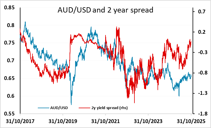 Tuesday’s calendar is light. The RBA meeting would normally be a focus, but there is effectively no market expectation of a rate move, with the chance of a move in December now also priced at less than 20%. However, the RBA may provide some sort of signal about their future intentions, and given that the market is now pricing so little chance of easing, the risks should be on the AUD upside, particularly given the decline in the AUD on Monday, which had little obvious rationale. Yield spreads and Asian equity performance both suggests some AUD upside risk, so unless we see some independent source that undermine s global risk sentiment, we would favour an AUD bounce.