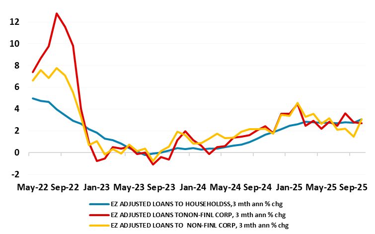 But the more discernible slowing in corporate credit growth may be more demand determined. The FSR notes that EZ corporates continue to face elevated debt servicing costs. While the recent cuts in interest rates have reduced costs for new corporate borrowing, the stock of outstanding debt is continuing to reprice at less favourable conditions, keeping debt service ratios elevated. Survey data show that most firms believe their financial positions are under strain from weaker external demand, which is squeezing their profitability. All of which suggests that such fresh signs of banking sector wariness that may be a sign that global risks have materialised rather than dissipated.