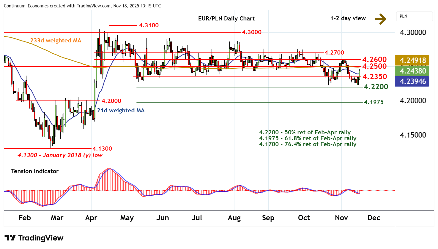 13:05 GMT - The anticipated break below critical support at the 4.2200 Fibonacci retracement has not been seen, as consolidation gives way to a sharp PLN-driven bounce. The break back above 4.2350 has turned sentiment neutral, and put focus on congestion resistance at 4.2500. Unwinding oversold daily stochastics and the flattening bearish daily Tension Indicator highlight room for a test of here. But mixed weekly charts should limit any break in renewed consolidation beneath 4.2600. Meanwhile, a close below 4.2200 is needed to turn sentiment negative and complete a multi-month distribution top beneath the 4.3100 current year high of 16 April, as focus then turns to 4.1975/00.