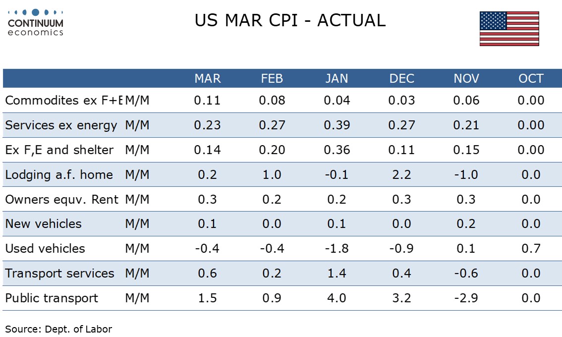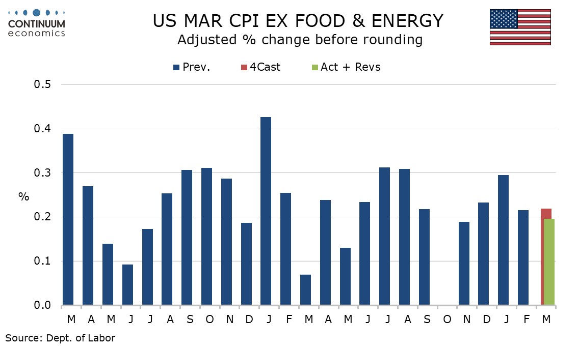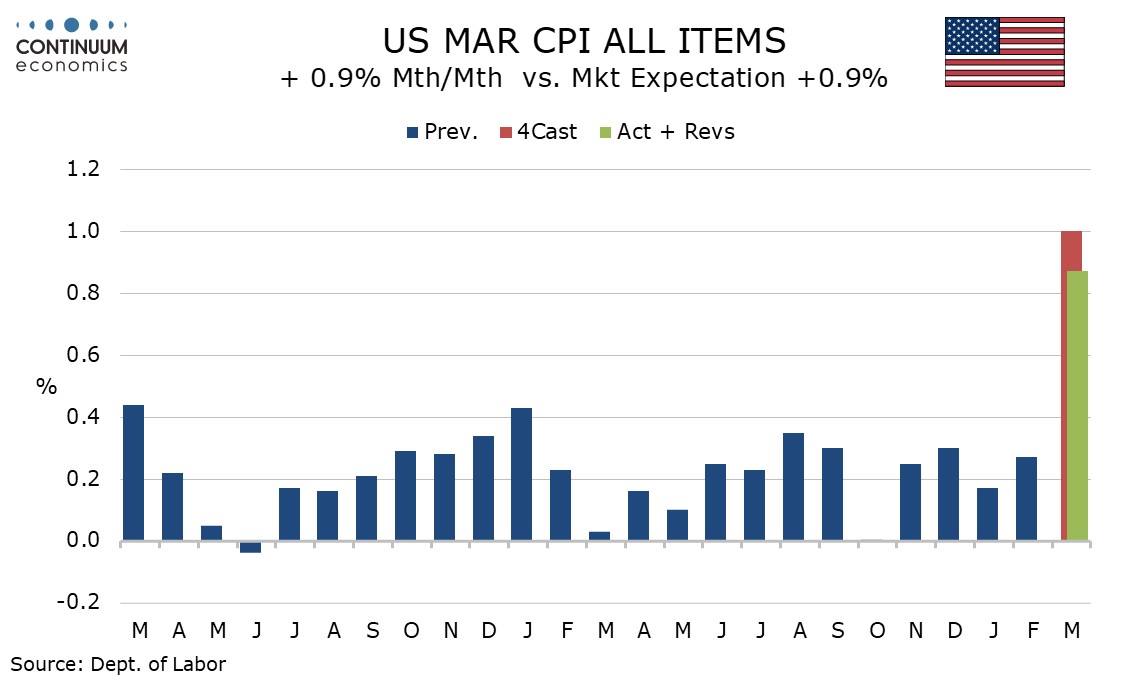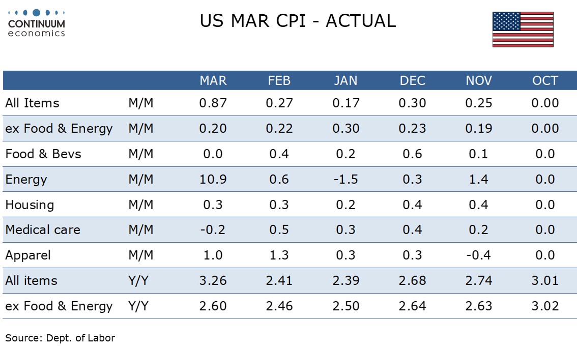 March CPI is as the market expected with a 0.9% increase (0.865% before rounding) led by a surge in energy, but the core rate ex food and energy shows little sign of feed through, rising by a lower than expected 0.2%, with the gain before rounding at 0.196%, the slowest since November’s subdued two-month outcome. Medical care was a significant source of restraint.
