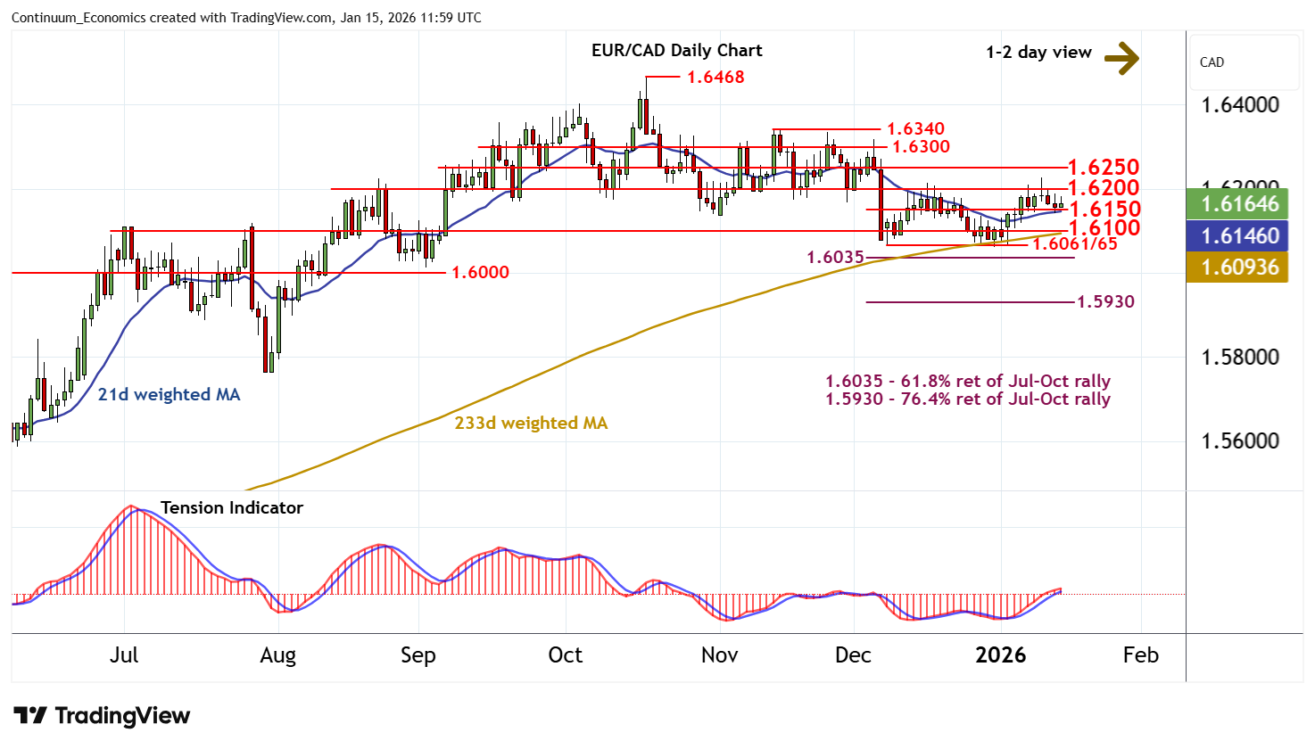 11:55 GMT - Still little change, as prices extend cautious/choppy trade within the 1.6150 - 1.6200 range. Intraday studies are mixed/negative and overbought daily stochastics are unwinding, highlighting room for a test below congestion support at 1.6150. But the positive daily Tension Indicator and improving weekly charts should limit scope in renewed buying interest/consolidation above further congestion around 1.6100. Meanwhile, a close above congestion resistance at 1.6200 would help to improve sentiment and open up a test of 1.6250.