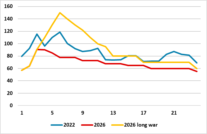In our Iran war scenarios (here) we attach a 65% probability to a 4-8 week Iran war, with the end of hostilities followed by at least a partial reopening of the Straits of Hormuz – though it is possible that a limited ceasefire could be agreed that sees a fuller reopening of the Straits of Hormuz. The main alternative scenario (with a 30% probability) is a 2-6 months Iran war, with the end of hostilities followed by a partial reopening of the Straits of Hormuz. Figure 1 shows our projection of WTI oil prices based on these two scenarios and compared to the 2022 Ukraine war. The wide range forecast for the 2-6 month reflects different potential duration of the war and also the scale of further energy infrastructure damage. For more details see the March Commodity Outlook (here).