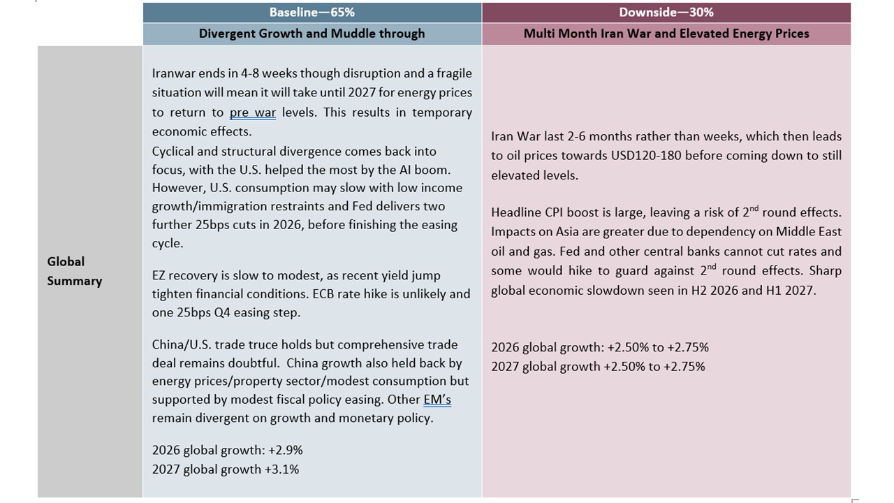 · For a 4-8 week war and 3-4 quarters of energy price normalisation, we see a 10% U.S. equity market correction in H1 2026 driven by the current Iran war and/or consumption slowing due to lower (real) wage growth, alongside still stretched valuations in equity and equity-bond terms. Then we see this being followed by a H2 2026 rebound on Fed easing that brings the S&P500 to 7200 by year-end 2026. 10yr U.S. Treasury yields down to 4.0% by end 2026 and EUR/USD at 1.24.