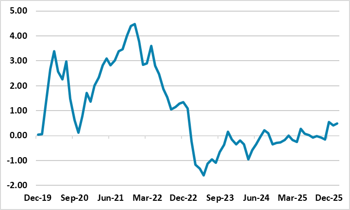 We would highlight four factors. Firstly, consumption trends at end 2025 were soft in the big 3 of the U.S./EZ and China. EZ reflects cost of living pressures, while China reflects adverse wealth effects from the property bust and slow wage growth. The U.S. faces a K shaped consumption pattern, with the top 20% of households spending freely but the other 80% worrying about cost of living. The picture in 2022 when the Ukraine war hit was different (Figure 5), with EZ consumption rebounding from depressed COVID levels; China depressed by late COVID shutdowns and the U.S. had seen most of its recovery in 2021. Consumer confidence is already being hit by the Iran war, which could result in a more cautious consumer in 2026.