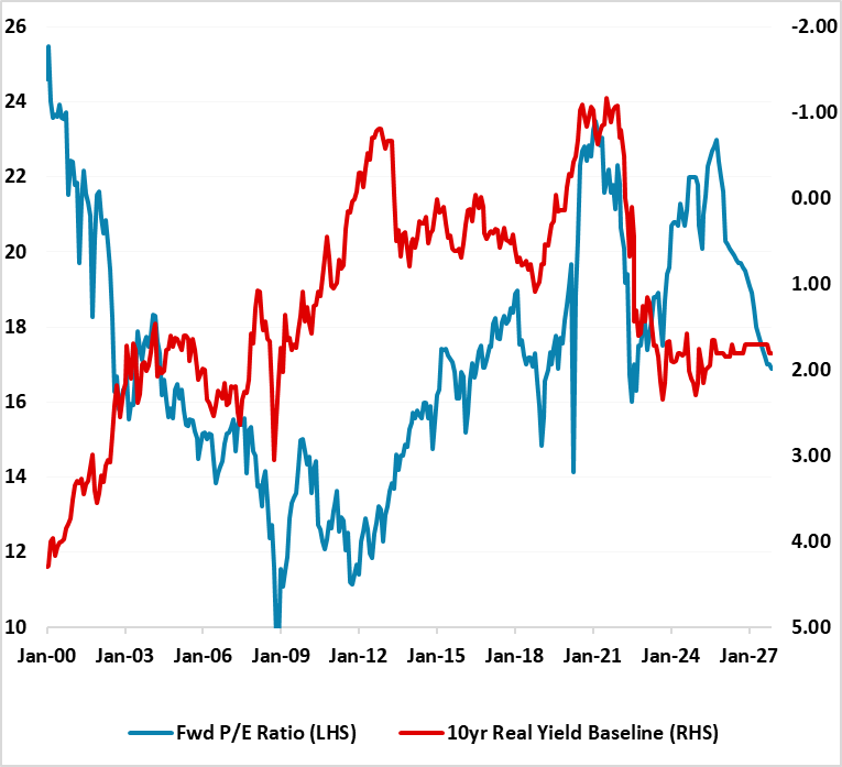 Source: Continuum Economics with forecasts to end 2027 for 10yr real bond yields and fwd P/E ratio.